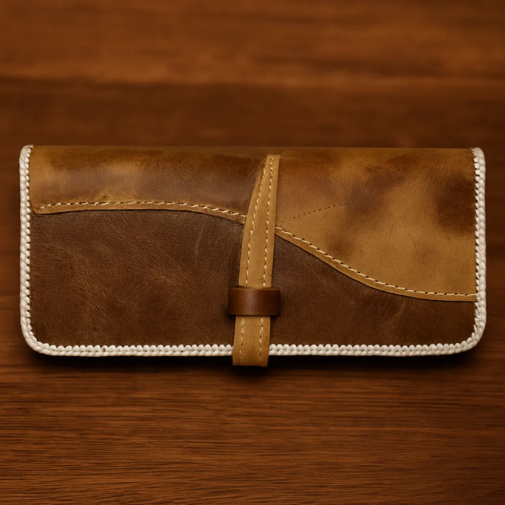 Billetera de Cuero Marrón con Cierre de Solapa y Costuras Decorativas