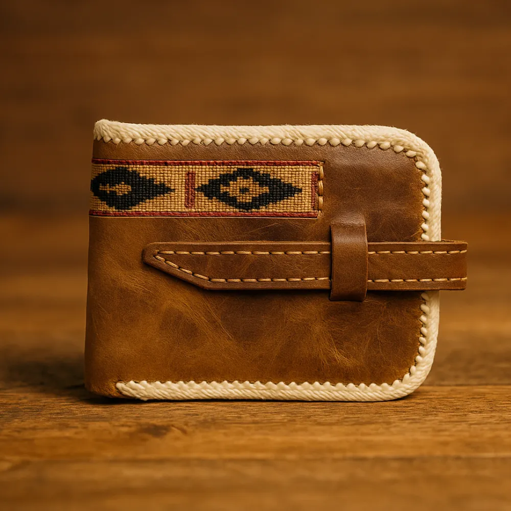 Es una pieza de marroquinería, elaborada en cuero genuino de tonalidad marrón rica y textura distintiva. Su diseño robusto se complementa con una costura en hilo blanco que bordea el contorno, resaltando la calidad artesanal.
