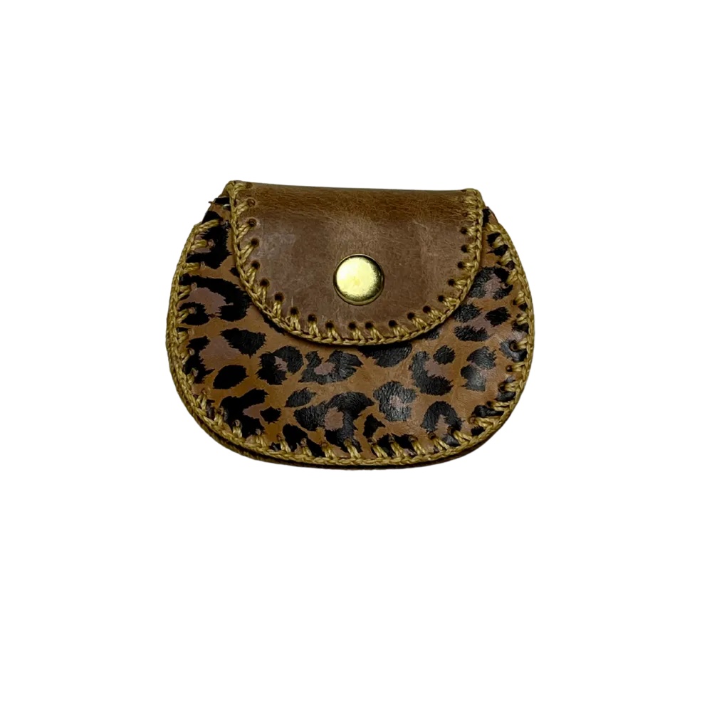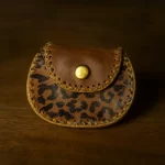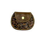 Combina la robustez del cuero marrón con un toque exótico. Su diseño redondo y compacto presenta un panel frontal con un estampado de leopardo, ideal para quienes buscan un accesorio con personalidad.